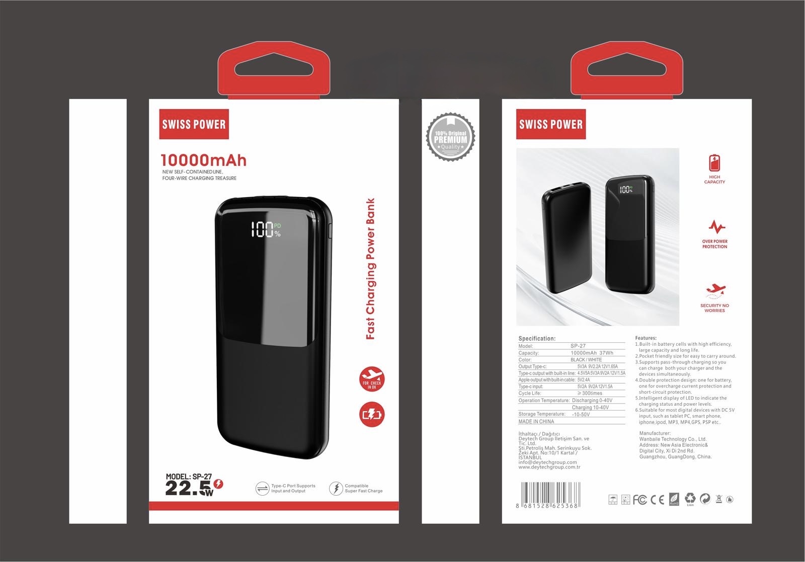 2 USB-A 1 USB-C PD Destekli 22.5W 10000 mAh Yüksek Kapasiteli Swiss Power Powerbank